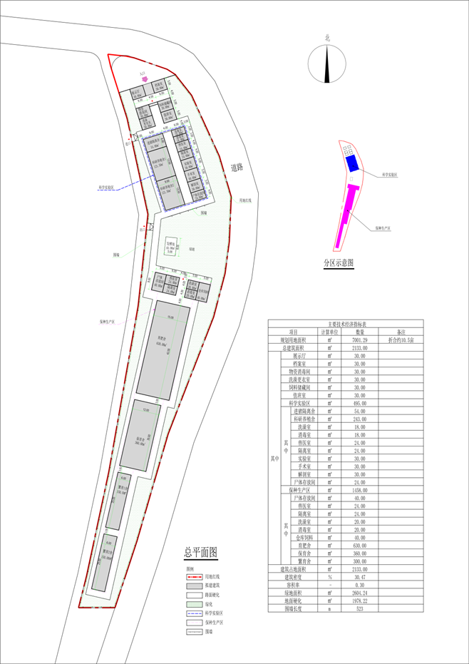 2.建设规模:项目占地面积10.5亩,约合7000平方米,建筑面积达2133平方米。包括:(1)小型猪保种生产区1458平方米,动物繁殖1舍(封闭群),动物繁殖2舍(近交系),保育舍,商品舍,附属设施;(2)科学实验区678平方米,动物试验养殖舍、进猪隔离舍,兽医室、隔离室、解剖室、手术室、实验室、尸体存放间,淋浴、消毒室,附属设施;(3)室外配套工程,道路,地面硬化,门前停车棚,进出猪平台,砖砌围墙,化粪池、氧化塘、猪粪棚,排水工程、配电工程(具体详见附件:建设方案)。勘察米数暂估为450米。